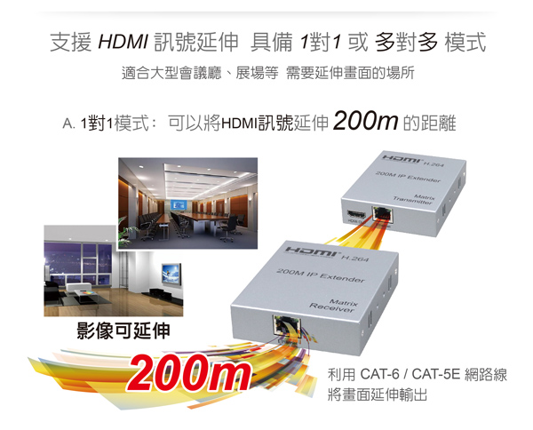 - 利用網路線,可將訊號延長到200公尺 (需自行購買)
