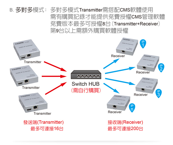 註:當您購買多組,要進行多對多連接時,會提供您CMS軟體,以方便您設定管理。軟體因授權的關係,只能免費授權給8台(Transmitter+Receiver),第9台以上必須自行購買授權。