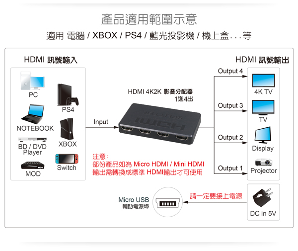 - 具備HDMI輸入:1埠/ 輸出:4埠,透過產品,可同時輸出4個畫面