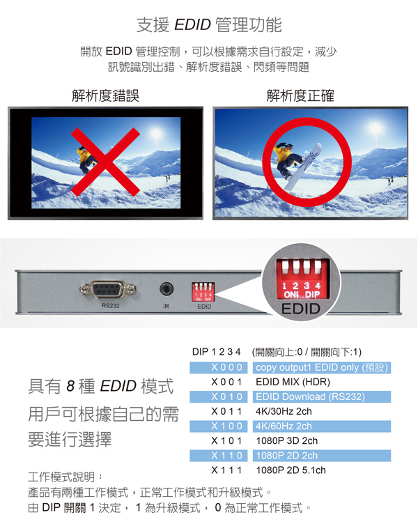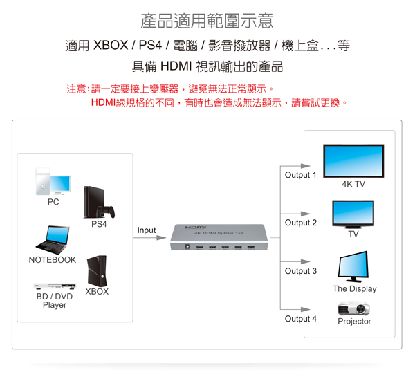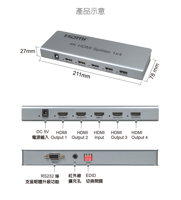 - 具備 輸入:HDMI 1 Port / 輸出:HDMI 4 Port