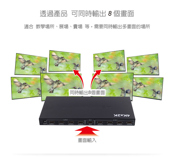 - 具備 輸入: HDMI 1 Port / 輸出: HDMI 8 Port。