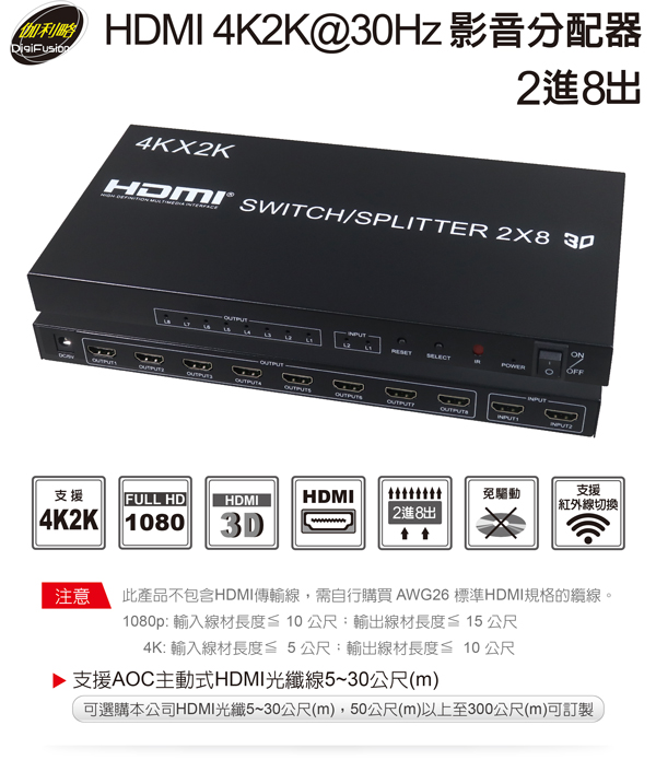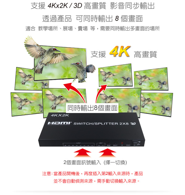 - 具備 輸入:HDMI 2 Port / 輸出:HDMI 8 Port