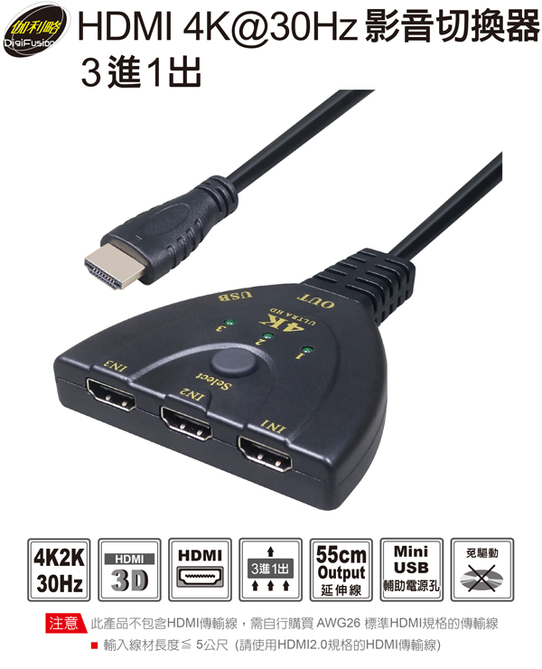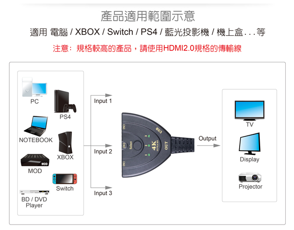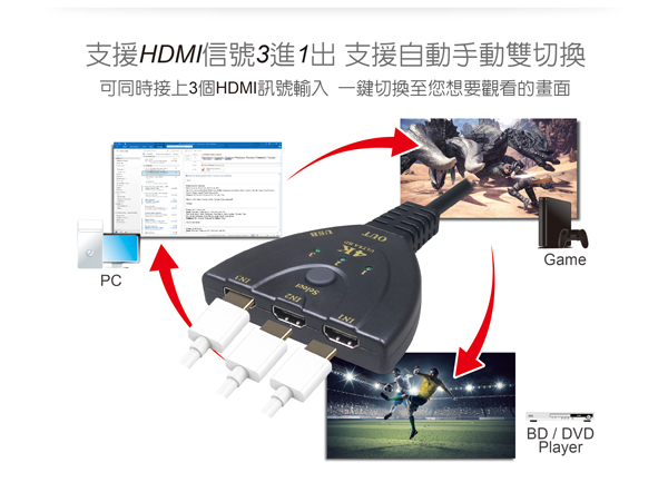 - 具備輸入: HDMI 3 Port / 輸出:HDMI 1 Port