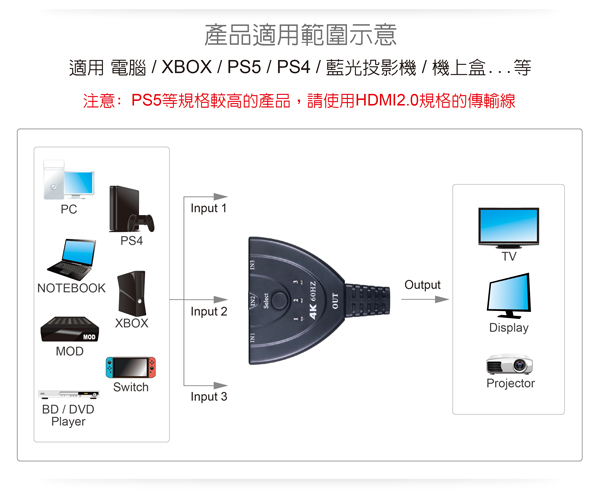 (注意: PS5等規格較高的產品,請使用HDMI2.0規格的傳輸線)