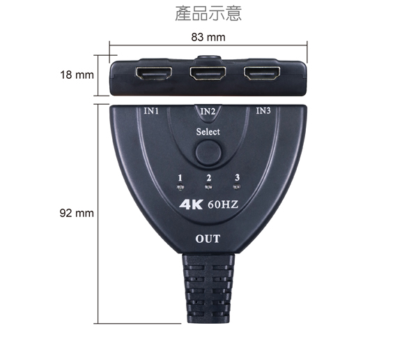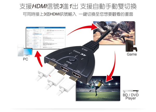 - 具備 輸入: HDMI 3 Port / 輸出:HDMI 1 Port