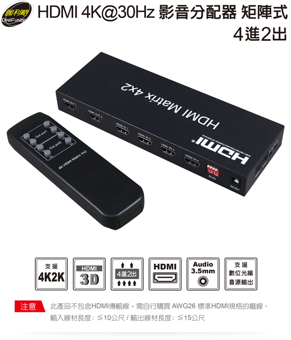 輸入線材長度: ≦10公尺 / 輸出線材長度: ≦15公尺