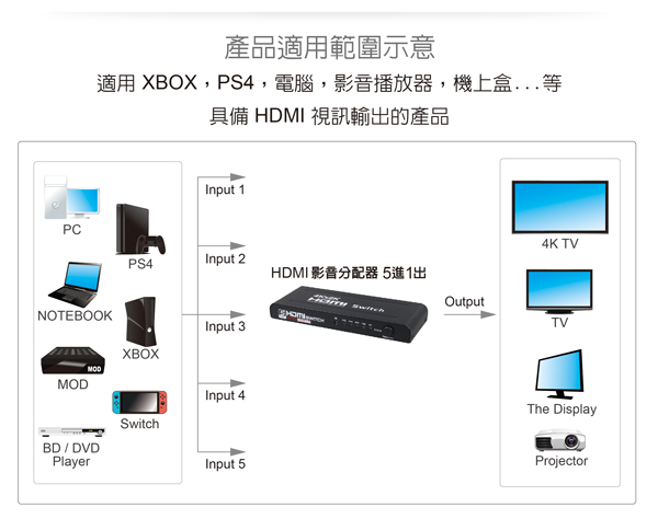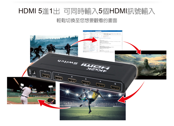 可同時接上5個HDMI訊號輸入, 一鍵輕鬆切換