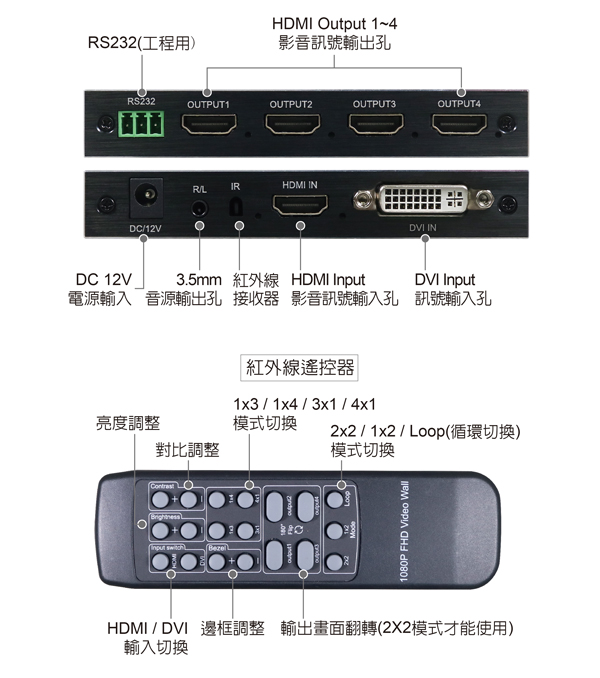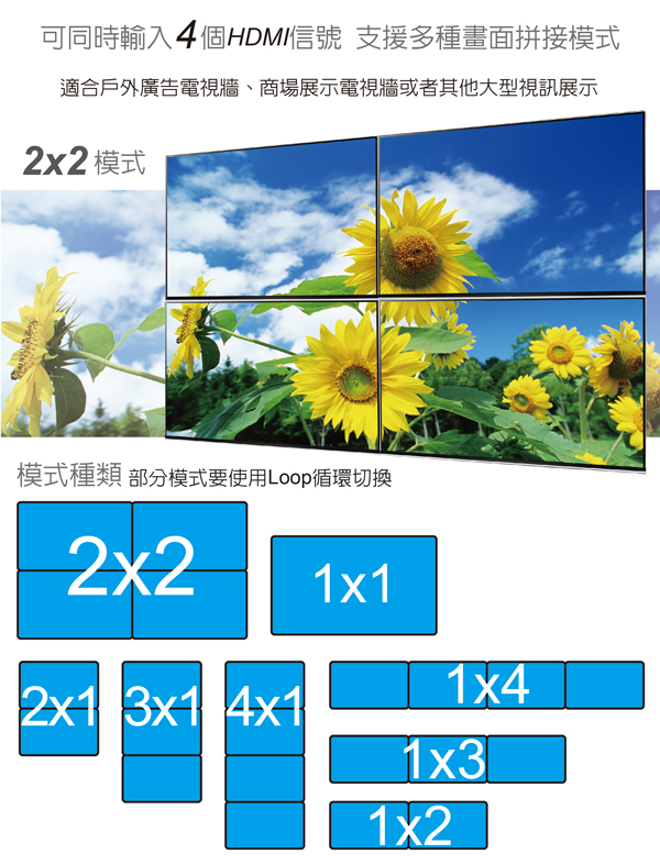 - 可同時輸入4個HDMI信號,支援多種拼接模式: (部分模式要使用Loop循環切換)