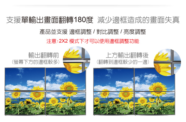 - 支援單輸出畫面翻轉180度,具備邊框調整 / 對比調整 / 亮度調整