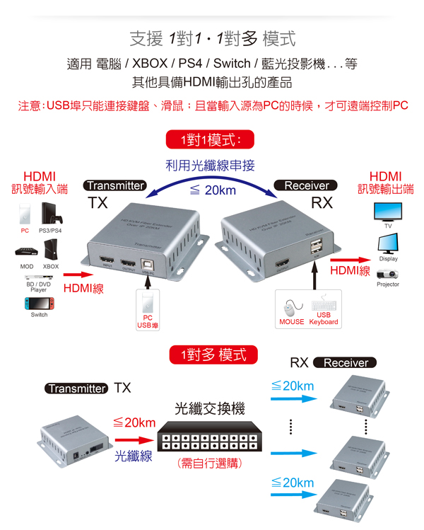 註.1對多模式需透過光纖交換機(最多可連接253個RX)