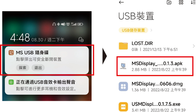 1. 利用轉接頭將USB轉HDMI轉換器連接到智慧手機或平板,之後會跳出訊息,選擇開啟內建的驅動資料夾,再點選 MSDisplay_Android_V2.0.1.3.apk 安裝APP |