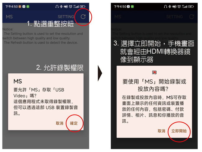 3. 開啟APP,依照下圖先點選 重整按鈕 > 允許錄製權限 > 開始錄製或投放內容,智慧手機或平板的畫面就會鏡像到顯示器上 |