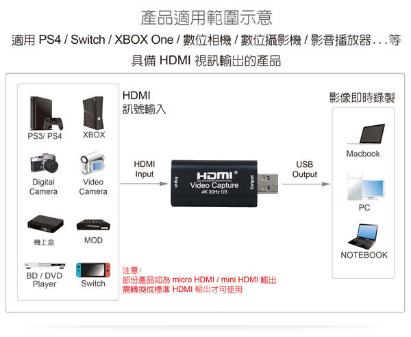 - 輸入支援: XBOX / PS4 / Switch / 數位相機 / 攝影機 / 影音播放器 等具備HDMI影音輸出的產品