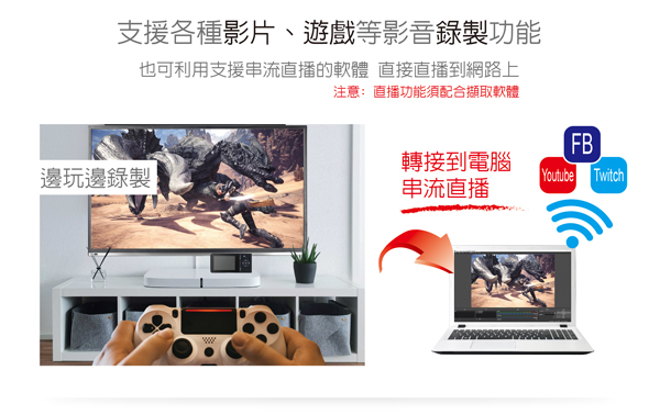 - 支援各種影片、遊戲等影音進行錄製或直播功能(必須配合軟體)