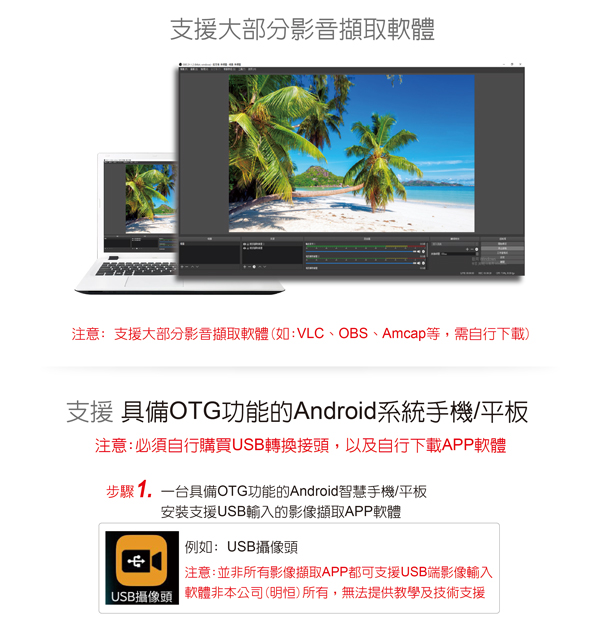- 支援大部分影音擷取軟體 (如:VLC、OBS、Amcap等,需自行下載)