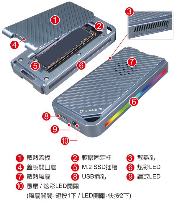 - 可獨立開關炫彩LED以及風扇(出廠隨機),隨開隨關並附帶記憶模式