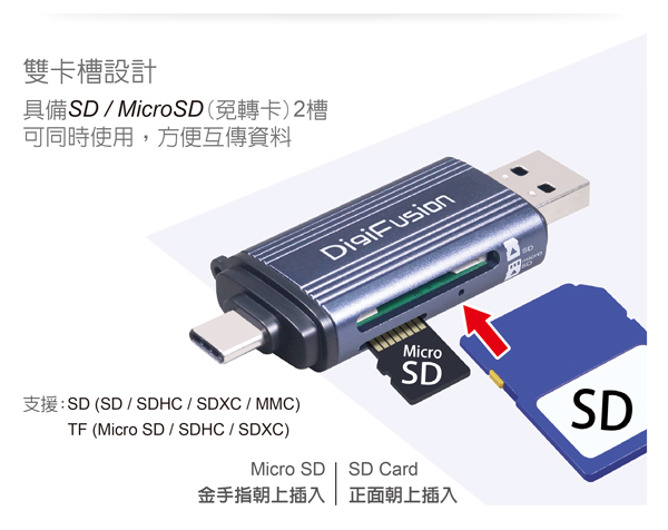 - 支援SD / MMC / RSMMC / Micro SD免轉卡