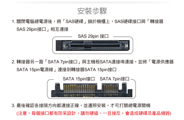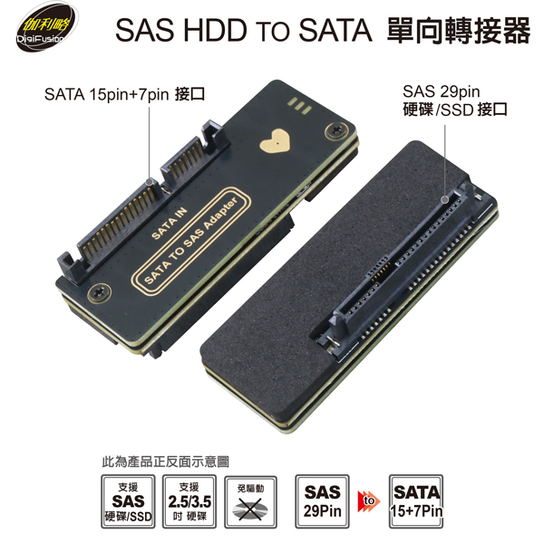 可將SAS硬碟/SSD轉成SATA介面,連接主機板SATA埠