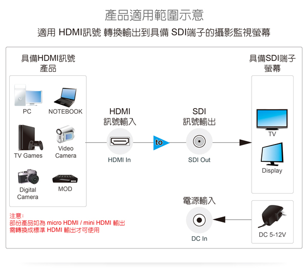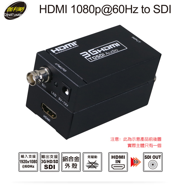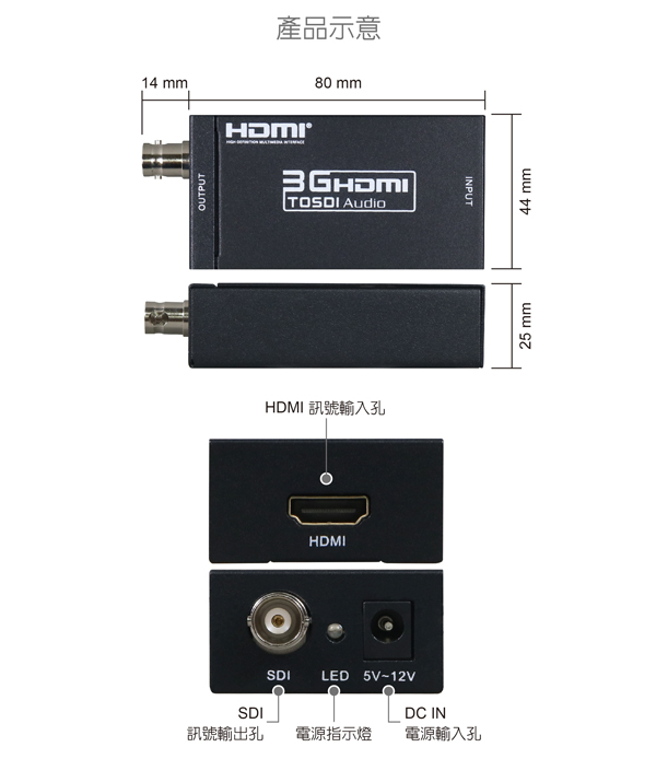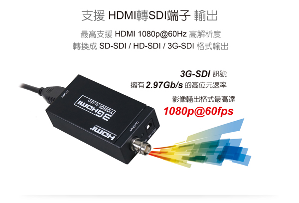 - 支援HDMI訊號轉換成SD-SDI/HD-SDI/3G-SDI訊號輸出