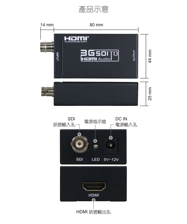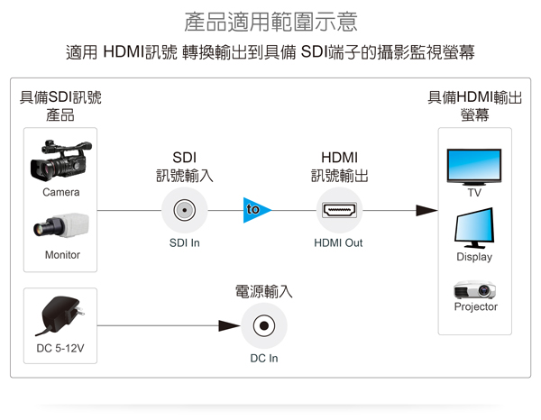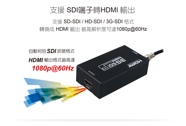 - 支援SD-SDI/HD-SDI/3G-SDI訊號轉換成HDMI訊號輸出