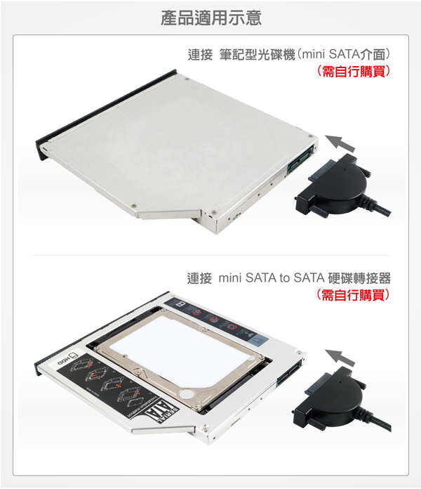支援 mini SATA 介面 筆記型光碟機 / miniSATA to SATA 硬碟轉接器