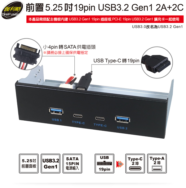 支援PC前置面板(5.25吋)擴充 USB3.2 Gen1 Type-C 2埠 +Type-A 2埠