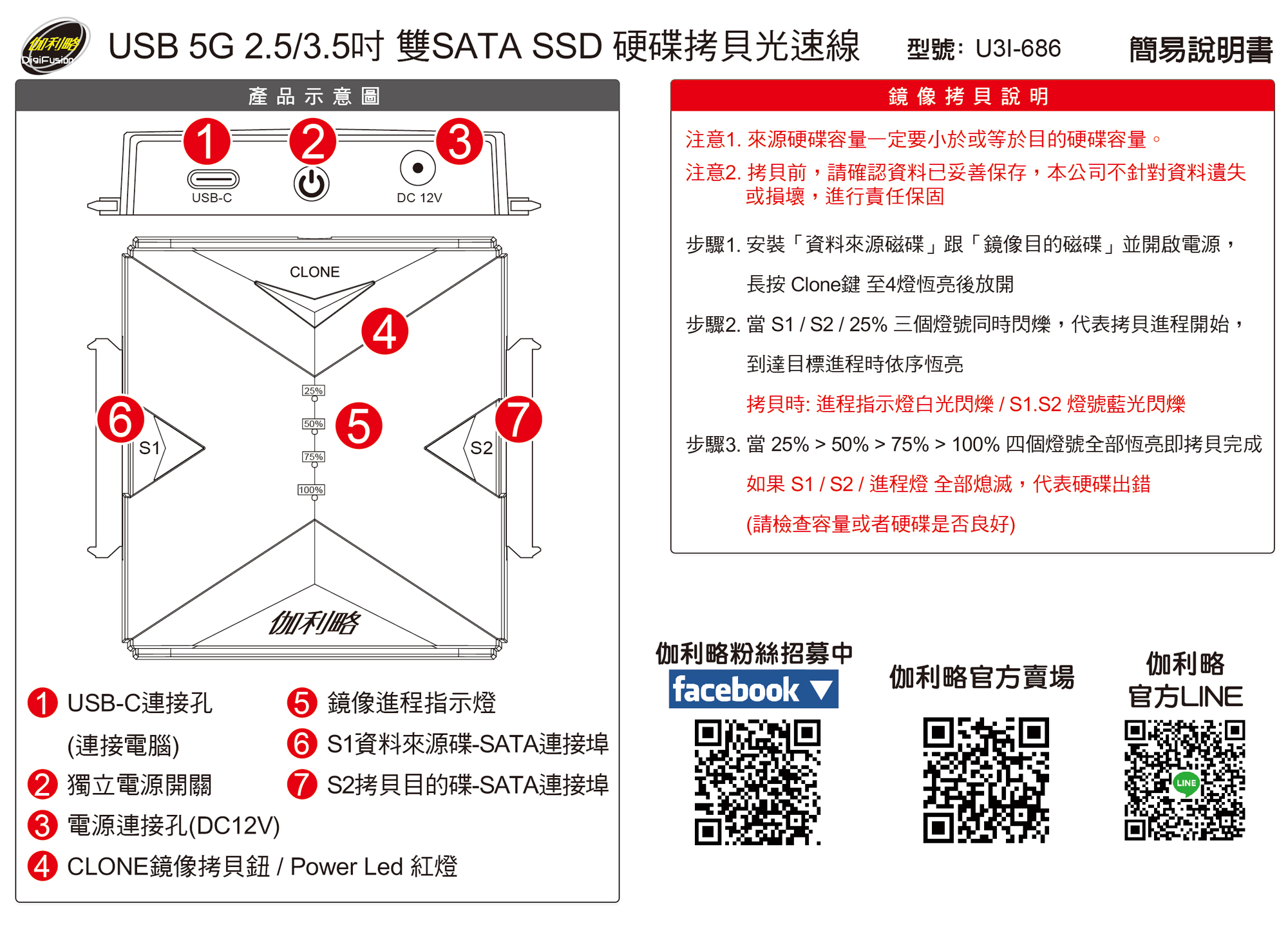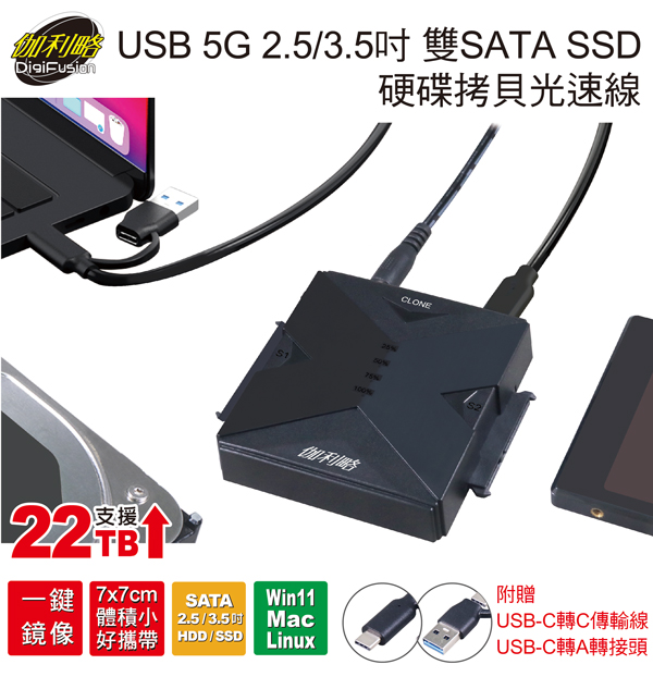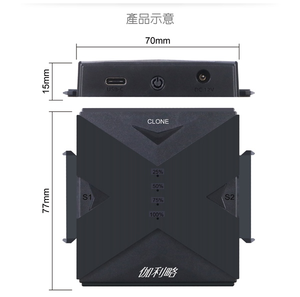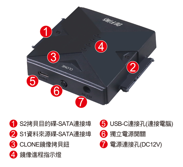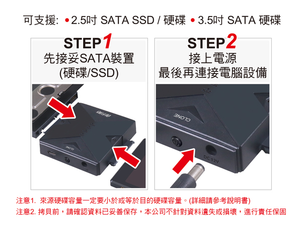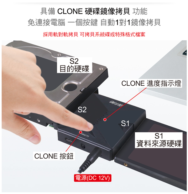 - 支援SATA HDD/SSD硬碟對拷,一鍵鏡像,無需電腦。採用軌對軌拷貝,可拷貝開機系統碟 / 特殊格式硬碟檔